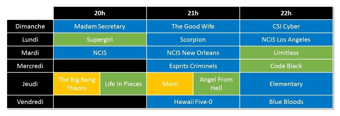 La chaine a proposé un certain nombre de nouveauté cette saison. Parmi elles, "CSI Cyber" est renouvelée même si ses audiences sont un peu décevantes. "Extant" a été lancée l'été dernier avec des audiences prometeuses mais elle n'a cessé de chuter au fil des épisodes de sa première saison. Reste à voir comment se déroulera sa seconde saison diffusée cet été. "Madam Secretary" a su s'imposer comme l'un des meilleurs nouveau drama de la chaine avec en moyenne 12 millions de fans, tout comme "Scorpions" diffusée le jeudi soir et qui a su séduire les téléspectateurs. Enfin, "NCIS New Orleans" a bien rempli sa mission. La série a su assurer à la suite de "NCIS", sans problème en ramettant en moyenne 15,8 millions de téléspectateurs.
